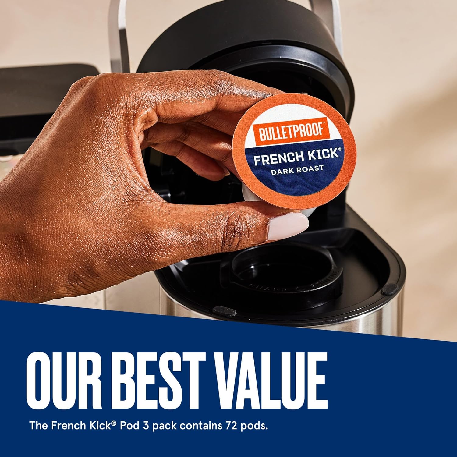 - Unbeatable Taste: Contains three boxes of 24 Bulletproof French Kick Dark Roast Single Serve Coffee Pods (72 Count Total), a clean coffee with a smoky, smooth and premium flavor, Packaging May Vary