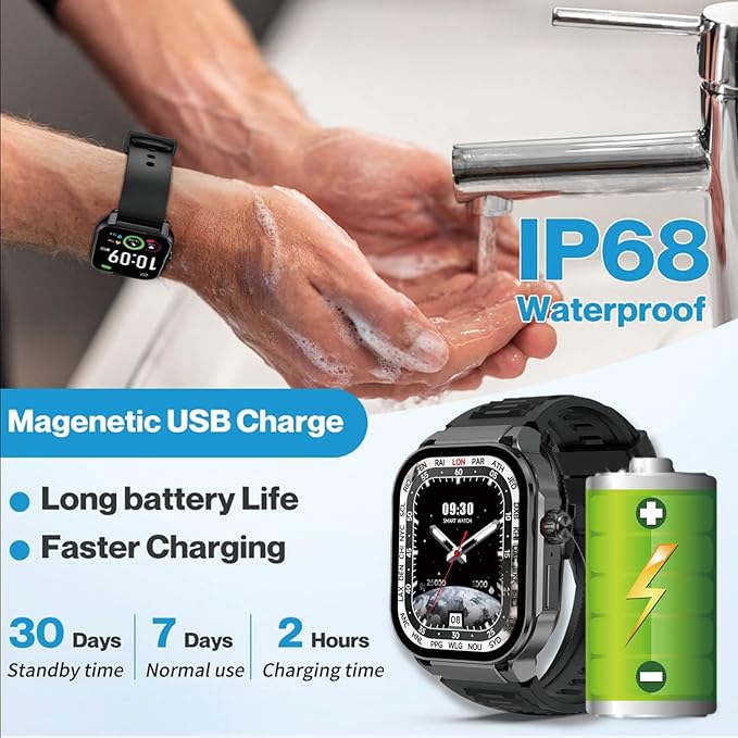 - Large battery content: magnetic suction charging, large battery capacity with 380mAh, about 2-3 hours charging time, then good for 6-7 day normal use and 15-20 days standby. IP67 waterproof design makes the watch meet your daily life needs. You do not need to take off the watch when you wash your hands, do outdoor exercises on rainy days. Compatible with iOS 10.0, android 4.4 and above. Go to the App Store or Google Play to download and install "Dafit" for free. Support multi-languages.