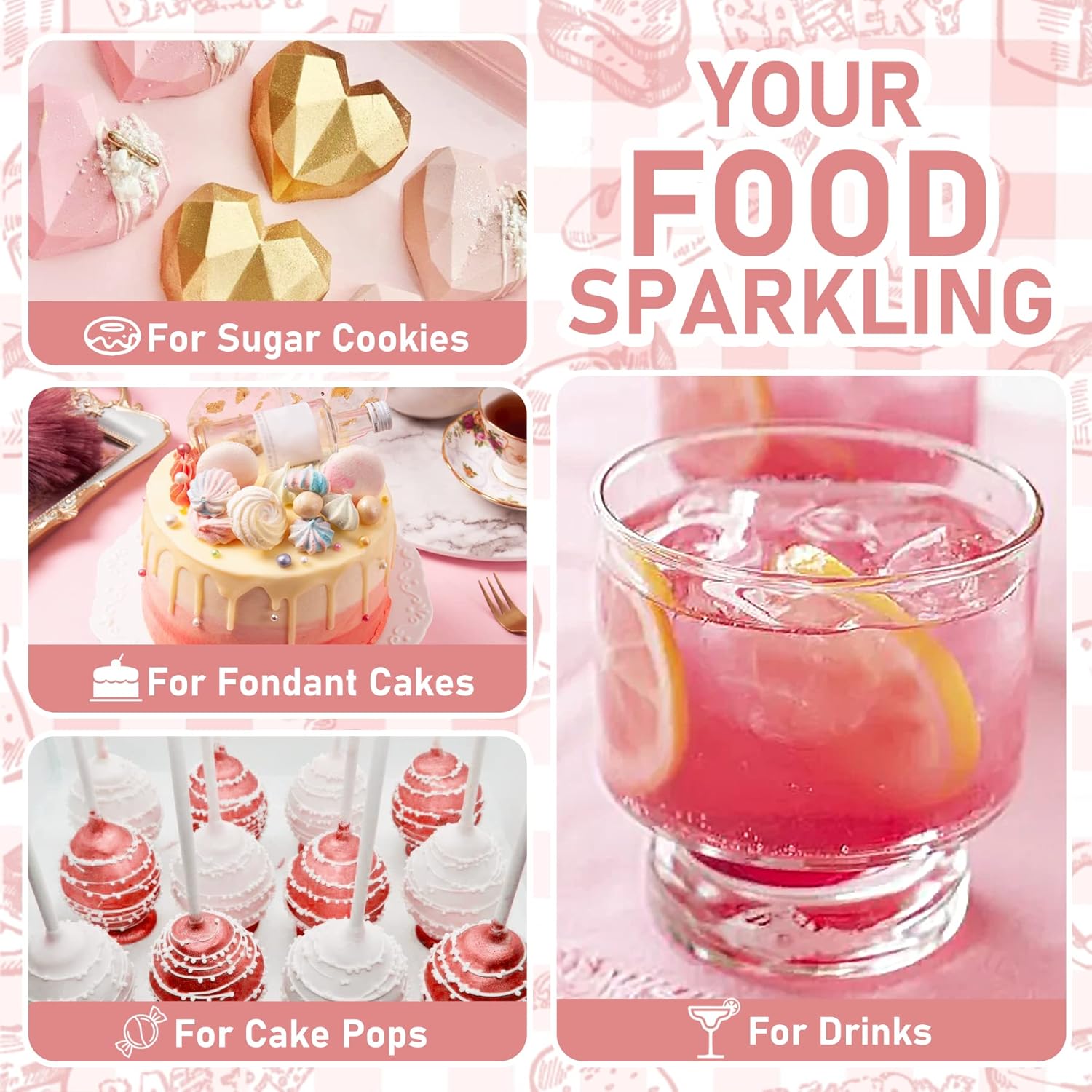 - WILDLY USED - A tiny amount of glitter powder is enough to create a stunning effect. This food-grade glitter powder can add a luxury shimmer to cakes decorating, cupcakes, cookies, wine, cocktails, champagne, and other baked goods and beverage.