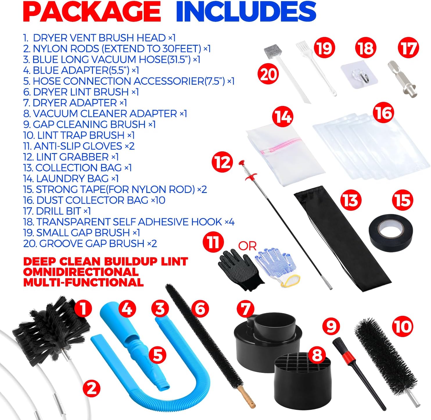 - COMPREHENSIVE DRYER VENT CLEANER KIT: Premium dryer cleaning set will help you deep clean buildup lint in the dryer; Package Includes Dryer Vent Brush Head x1,Nylon Rods,Vacuum Cleaner Adapter x1,Dryer Adapter x1,Dry Lint Brush x1,Blue Long Vacuum Hose(31.5”) x1,Blue Adapter(5.5”) x1,Hose Connection Accessories(7.5”) x1,Lint Trap Brush x1,Lint Grabber x1,Collection Bag x1,Anti-Slip Gloves x1,Strong Tape(for nylon rod) x1, Dust Collector Bag x5,Laundry Bag x1, Drill Bit x1