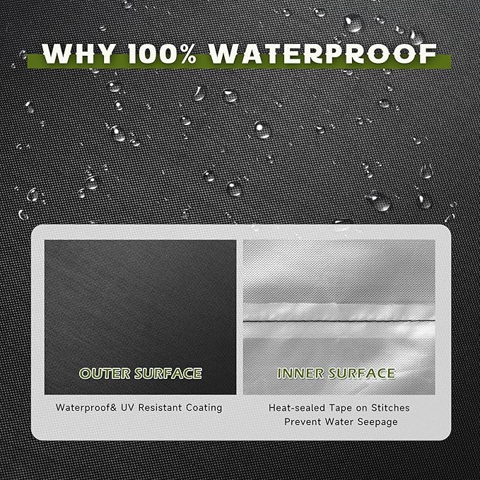 - WATERPROOF DESIGN– 100% waterproof outer coating and heat-sealed tape on stitches prevent water seepage. Two waterproof zippers are designed for easy installation and ensure its water resistance