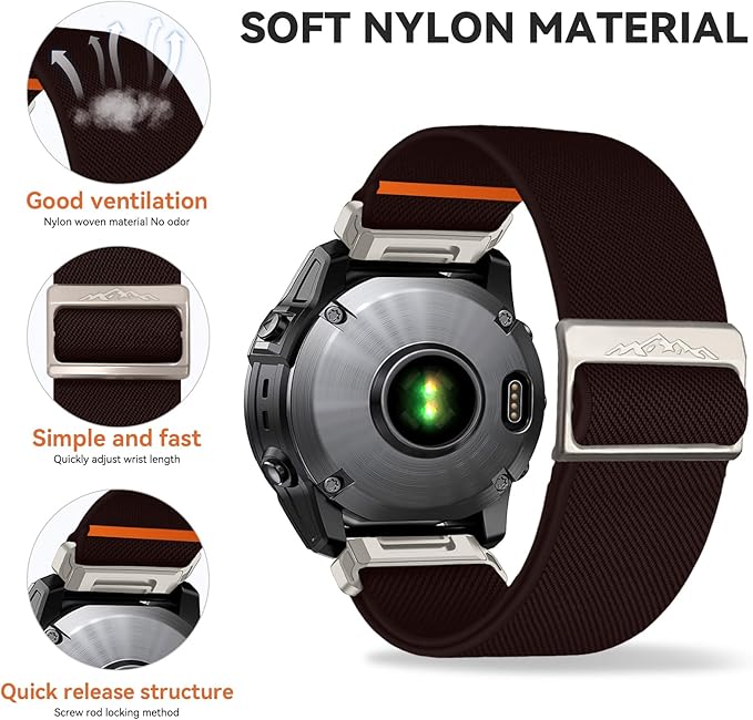 - 【User-Friendly Material】Compatible with Garmin Fenix 6x/Fenix 5x/Fenix 7x bands elastic nylon braided strap is made of high quality stretchy nylon, super soft and lightweight, breathable and comfortable. This eco-friendly nylon and the sweat-absorbing property make this strap super skin-friendly.