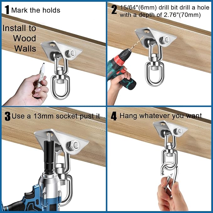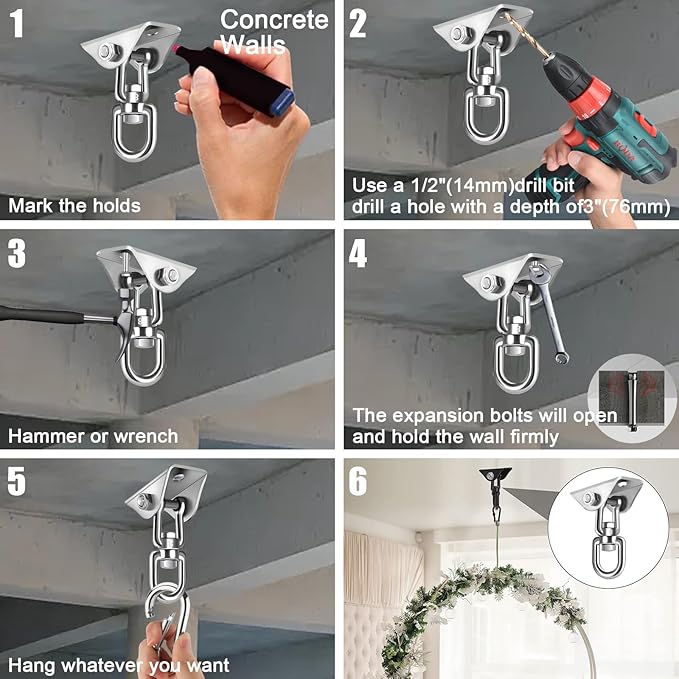 - 🔗Package Includes : Our hammock hanging kit Includes 2pcs SUS 304 Stainless Steel Hammock Hanging Kit, 4pcs expansion stainless bolts for concrete wall, 4pcs threaded stainless screws for wooden boards and 2pcs carabiner hook ups.Hammock hanging kit,hammock chair hanging kit,porch swing hanging kit,hammock hooks heavy duty, hammock hooks,hanging chair hardware,hammock kit,hammock with stand,hanging chair for bedroom,hammock chair swing,hammock straps,hanging chair outdoor,punching bag hanger.
