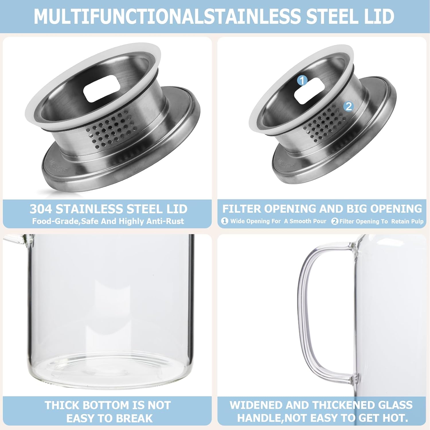 - ELEGANT DESIGN, MORE PRACTICAL: Specially designed with an anon-dripping spout and ergonomically designed handle makes it easy to hold and pour. Handmade, beautiful looking, large handle for comfortable grip. Our glass water carafe is both sturdy and light, The high-quality borosilicate glass and the thickened bottom make it can be used for ages. The practical and beautiful juice pitcher can basically meet your family's daily needs