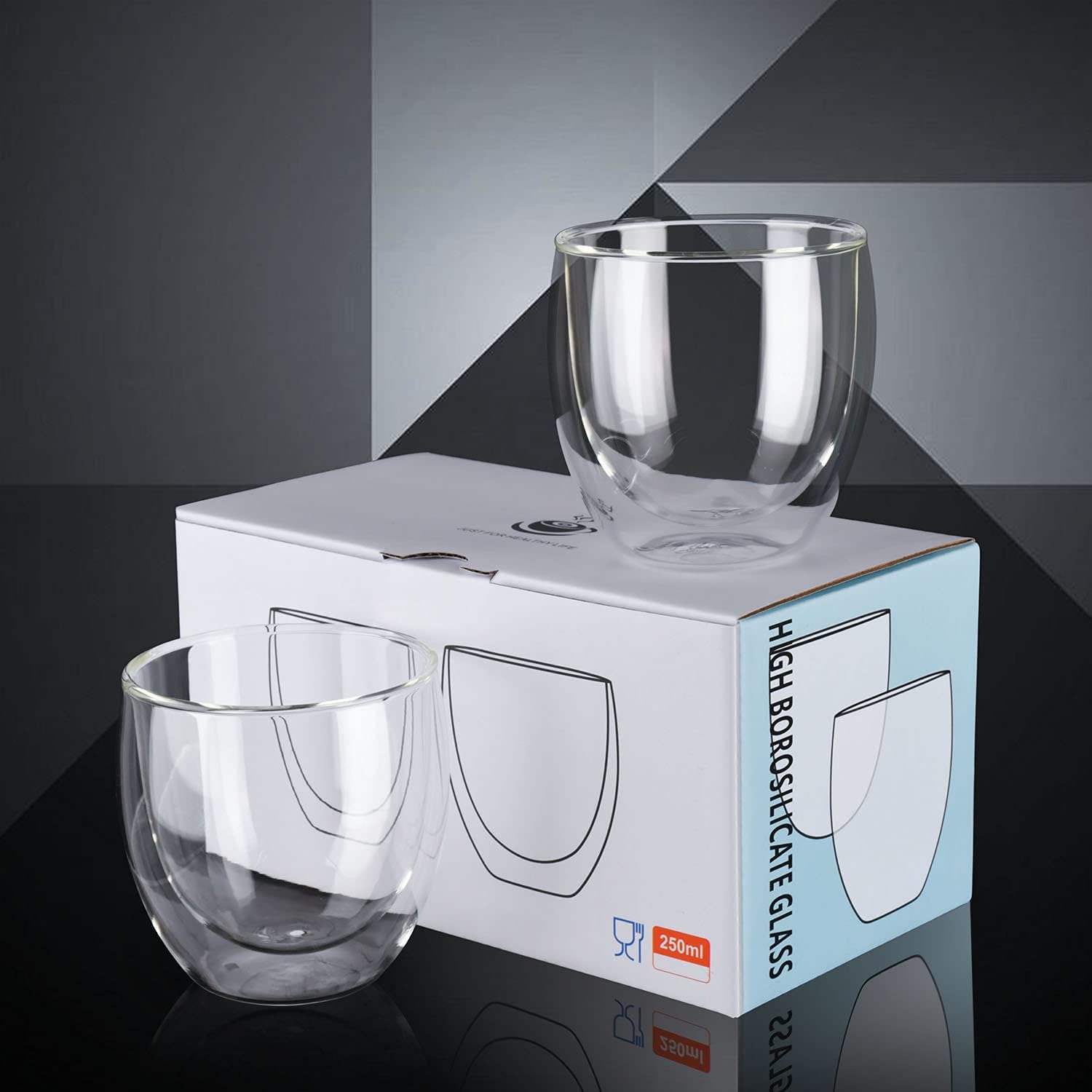 8oz Glass Coffee Mugs Set of 2, Double Walled Espresso Cups for Latte Cappuccino Cocoa Milk Cafe Juice, Clear Glass Tea Cup Set Glassware Gift for Christmas Birthday