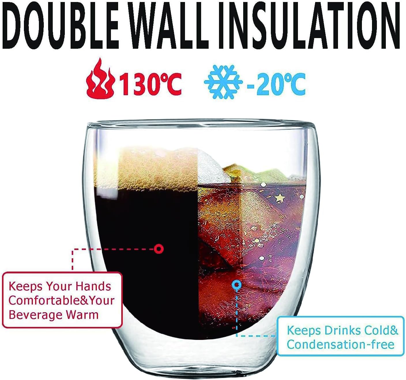 - Unique Double Wall Design - Insulated espresso shot glasses has a sleek 2 layer design that creates a dramatic optical illusion and prevents condensation and side heat transfer.