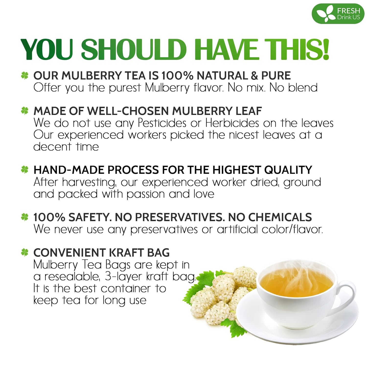 FreshDrinkUS Premium 75 Mulberry Leaf Tea Bags, 100% Natural & Pure. Loose Leaf Herbal Tea. Made with Natural Material Tea Bags. No Sugar, No Caffeine, No Gluten, Vegan