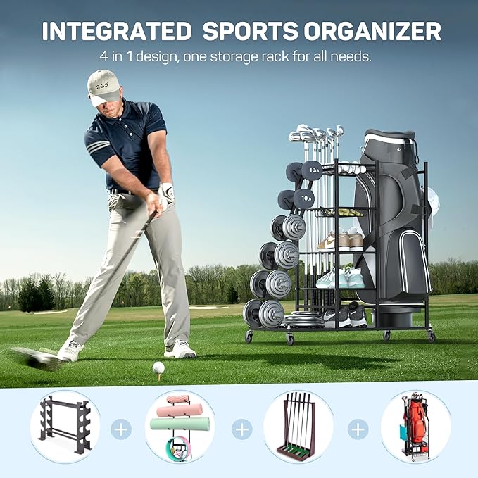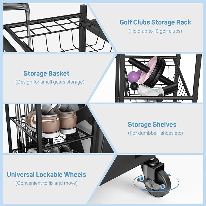- 【Versatile Storage Solution】: This multi-functional storage rack is designed to store a variety of items, including dumbbells, kettlebells, yoga mats, golf bag, golf clubs and more. Perfectly organize all your workout and golfing essentials in one convenient storage unit.