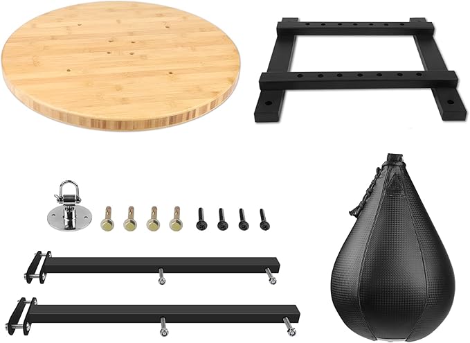 - Package Includes: 1 wall-mount frame, 2 steel tube, 1 Hardwood platform, 1 Speed bag bearing swivel, 1 speed bag(10‘’x7"), 1 Hand pump with Air needle, Screws