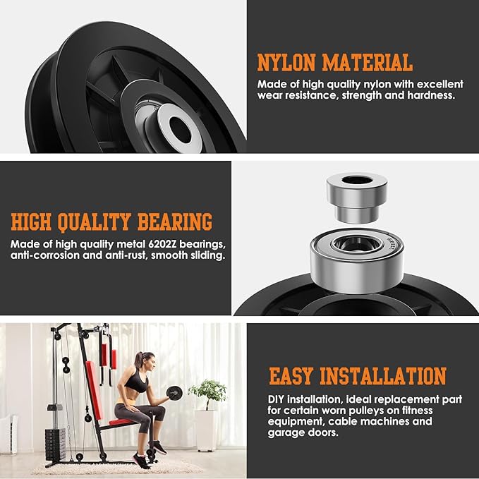 - Multiple Uses: The nylon gym pulley with bearing can be used as a replacement accessory for home gym equipment, gym tension ropes, DIY home projects, clotheslines, cable machines, garage door pulley lifting systems and more