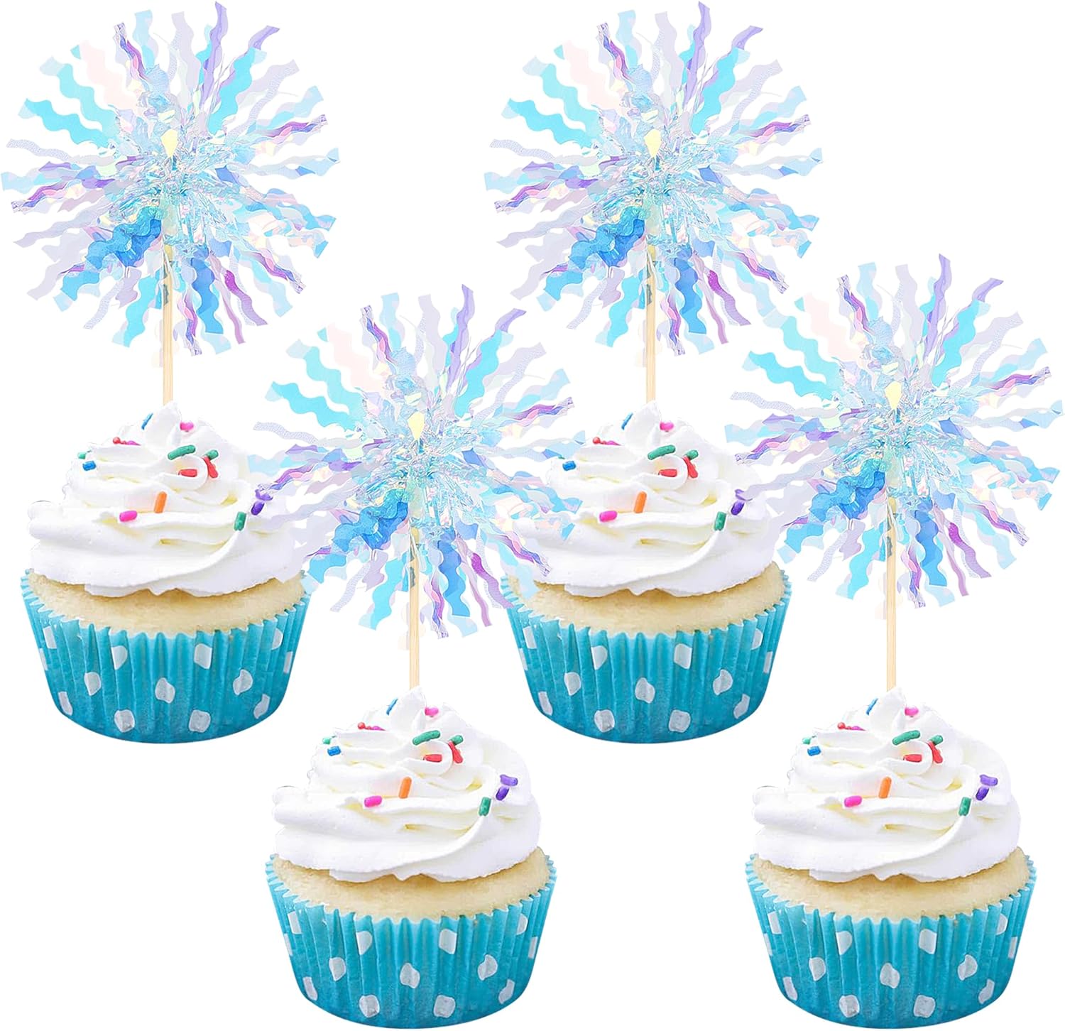 30 PCS Foil Firework Cupcake Toppers Sparkle Tinsel Cupcake Picks Happy Birthday Cake Toppers Drink Stirrers Cocktail Food Fruit Toothpicks for Baby Shower Wedding Party Decorations Supplies Blue