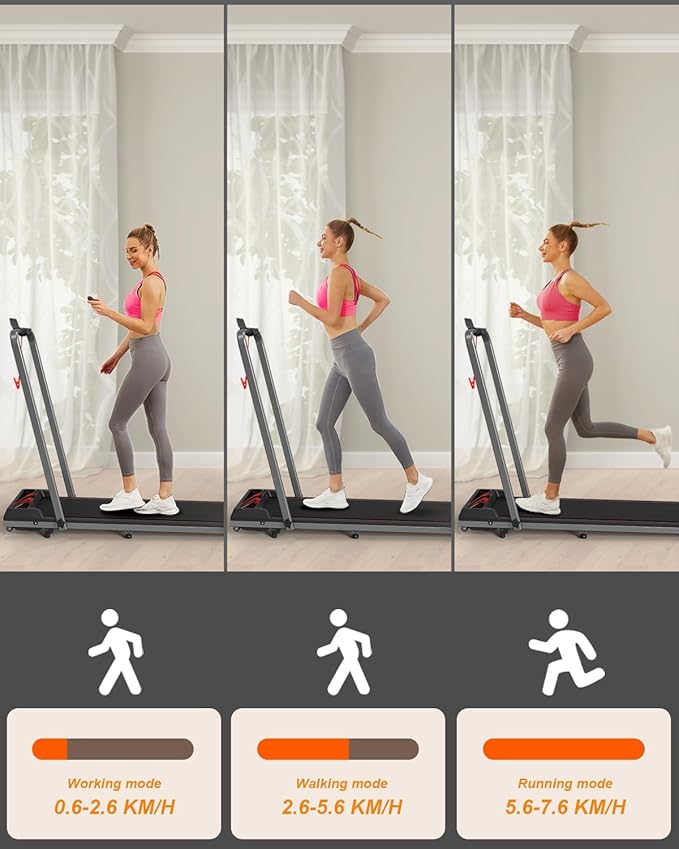 - 2 in 1 folding treadmill with two exercise modes. Walking mode speed range is 0.6-3.8mph, and running mode speed range is 0.6-7.6MPH. This allows the treadmill to adapt to your personal exercise needs, whether low- walking or high- running.