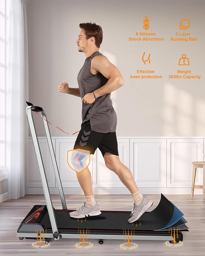 - FIVE-LAYER NON-SLIP RUNNING BELT & SHOCK ABSORBENT SYSTEM: This treadmill features a five-layer non-slip running belt that provides a running area of 39.37" x 15.75". It is equipped with a shock absorbing system that cushions your knees, muscles, and ankles, making it safer and more comfortable for you to run and walk on the treadmill.