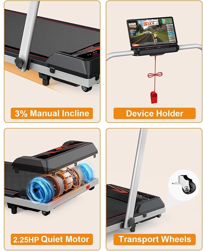 - 2.25HP QUIET MOTOR & 3% INCLINE ANGLE: Powerful 2.25 HP motor delivers a weight capacity of up to 220 lbs. 3% incline angle optimizes your workout, enhances calorie burning and maximizes workout efficiency.