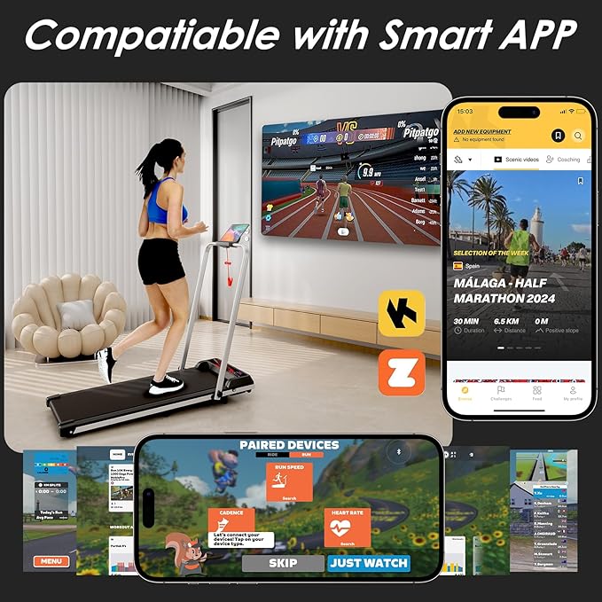 - NO INSTALLATION & EASY STORAGE DESIGN WITH SMART APP CONNECTION: This 2 in 1 treadmill comes assembled and ready to use right out of the box. It folds up for one-step access, and it is equipped with mobility wheels for easy lifting and moving. Works with KINOMAP, ZWIFT APP where you can join running races with family and friends and stay connected and motivated during your workout. It is perfect for home, apartment and office use.