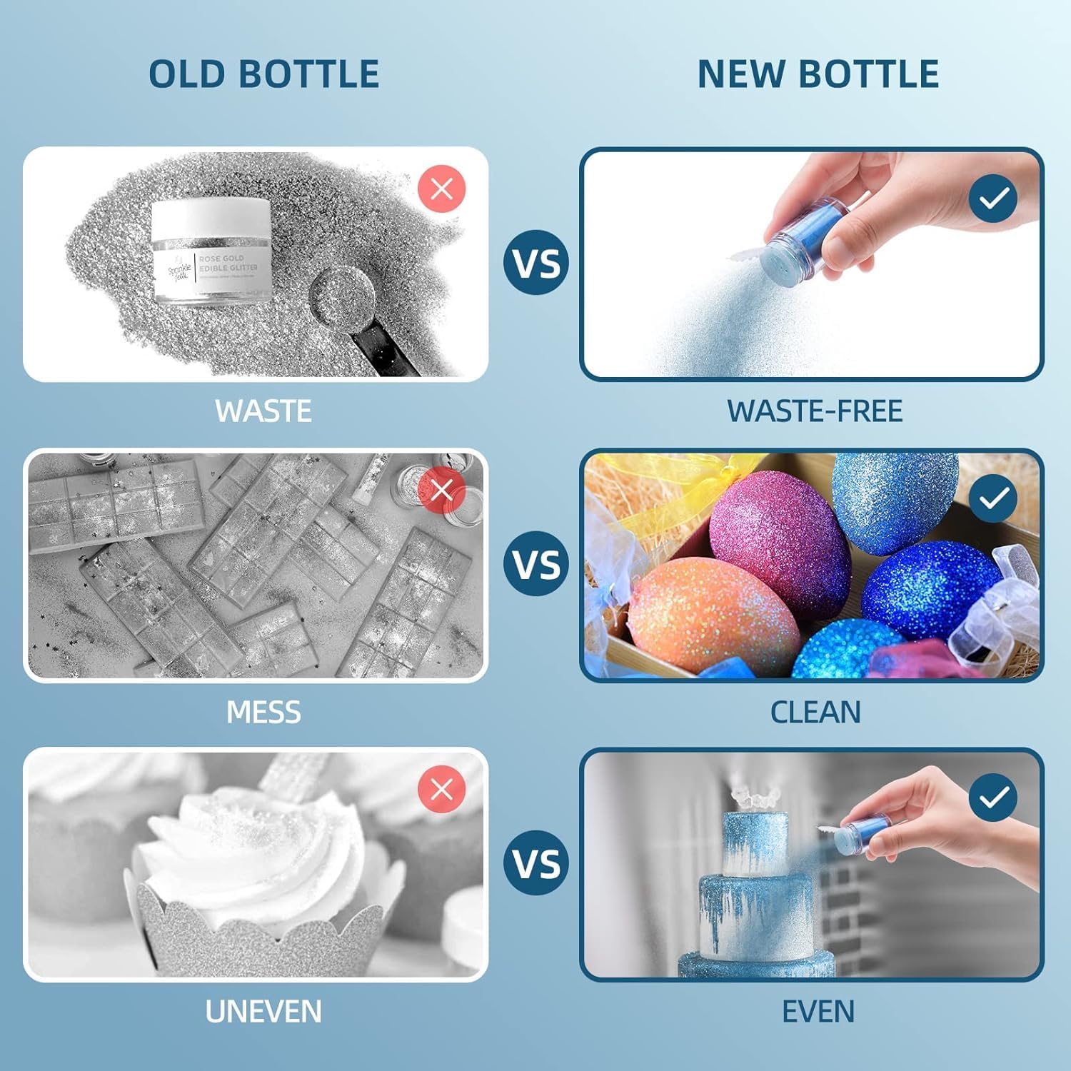 - EASY TO USE - Edible glitter powder is packed in the easy-pour jar, you could easily and precisely apply the luster powder to your projects. Brush dry onto your projects directly, or dilute it with vodka or oil-based flavorings to apply on food with a brush. Please do not mix it with water or it will be clumpy.