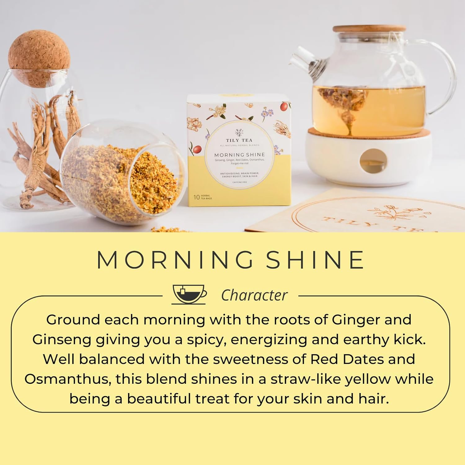 Tily Tea Morning Shine Breakfast Tea - Natural Herbal Tea for Focus and Energy - Ginger and Gingseng - Caffeine Free - 10 Plastic-Free Tea Bags