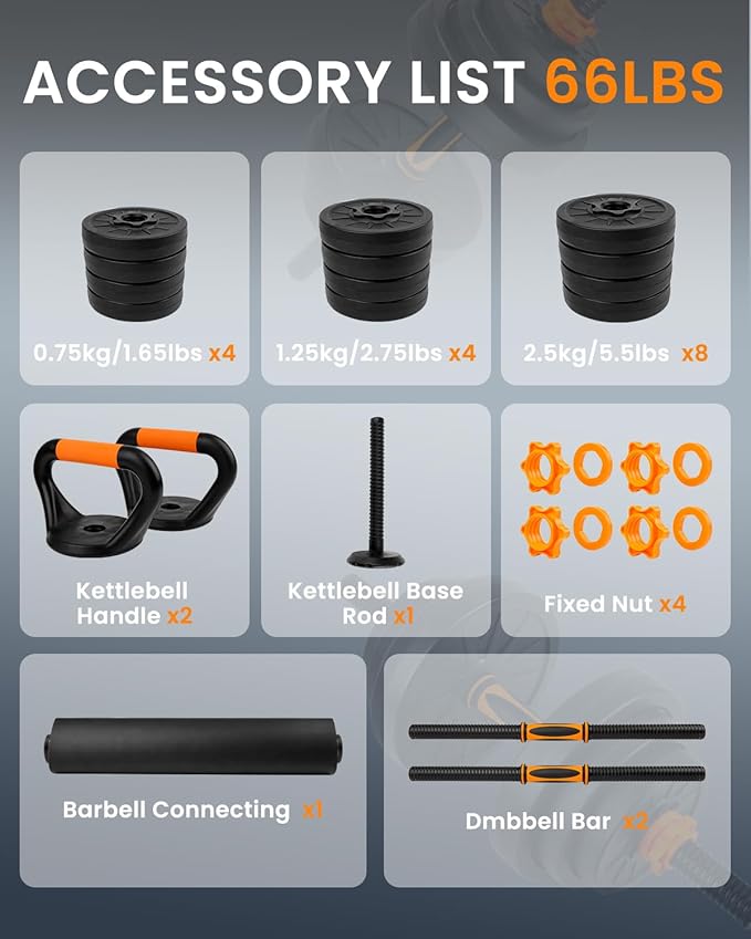 - 【WHAT YOU GET】NOTE: If there is a problem with the nut you received, please contact us in time and we will send you a new nut. Package includes 4 x 0.75kg/1.65lbs Dumbbell plates, 4 x 1.25kg/2.75lbs Dumbbell plates,8 x 2.5kg/5.5lbs Dumbbell plates, 1 x Connecting Rod, 2 x Dmbbell Bar, 2 x Kettlebell Handle, 1 x Kettlebell Base Rod, 4 x Fixed nut. If you have any questions about the products, please contact our customer service team