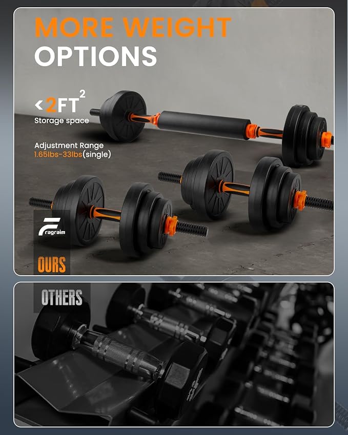 - 【4 in 1 MULTIFUNCTIONAL DUMBBELL SET】With The Fragraim weights dumbbells set, you can get a pair of dumbbells also barbells, kettlebells and push-up stands, which help you do many exercises including bench presses, squats. A complete set of dumbbells perfect for presenting the home gym workout
