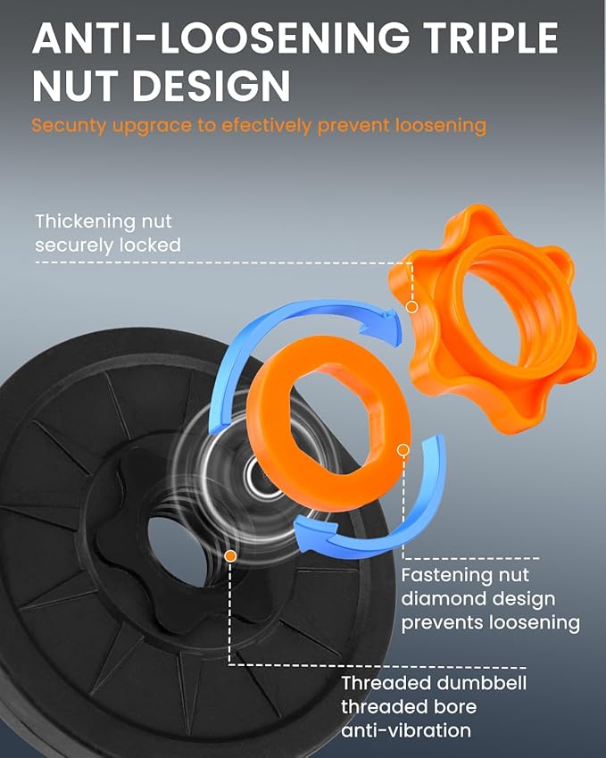 - 【ANTI-LOOSENING TRIPLE NUT DESIGN】The adjustable free weights set contains non-slip fastening, thickened nut threads and Threaded dumbbell ensure a secure fit with the dumbbell or barbell bar, effectively keeping the dumbbell pieces secure. Keeps you safe in use. Smooth fingertip grip ensures quick and easy mode switching