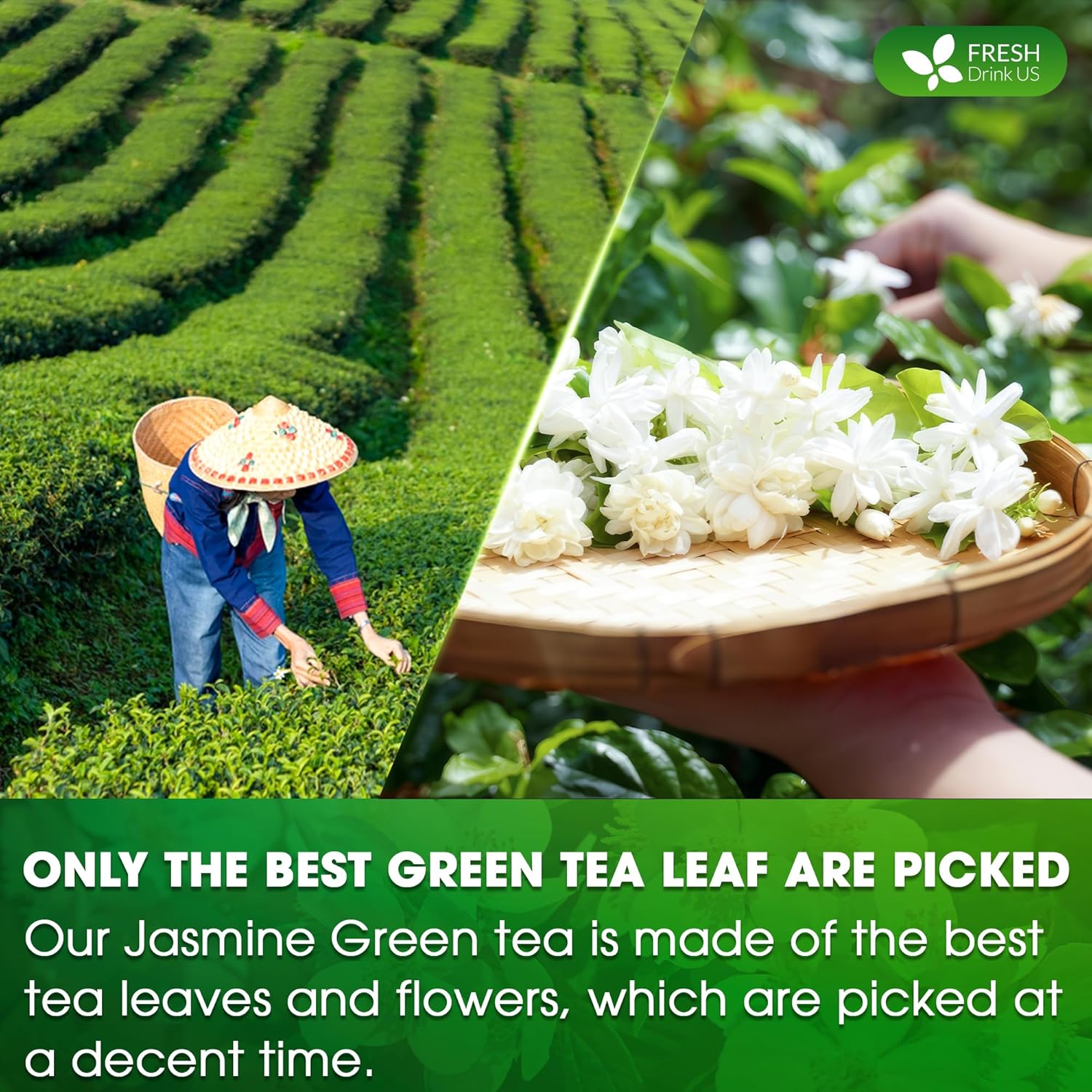 - ☘️ JASMINE GREEN TEA BAGS MADE BY A HAND-MADE PROCESS: Green Tea leaves are picked at their flavorful/colorful peak and naturally sun-dried to perfection. We scent the Green tea leaves by Jasmine flowers for the utmost quality. Then we grind the herbal leaves into the best tea size. Next, we immediately pack it in eco-friendly tea bags. Lastly, we pack the tea bags into food-grade kraft bags for ultimate freshness.