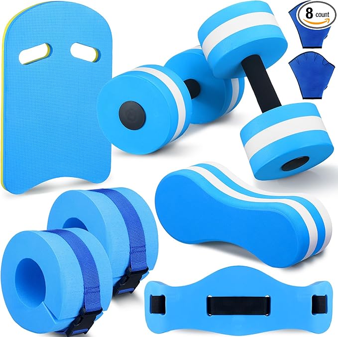 8 Pcs Water Aerobics Set Including Exercise Foam Dumbbells Aquatic Swim Belt Pull Buoy Swim Kickboard Sport Gloves Water Weights Equipment for Aquatic Fitness Weight Loss Fitness Tool