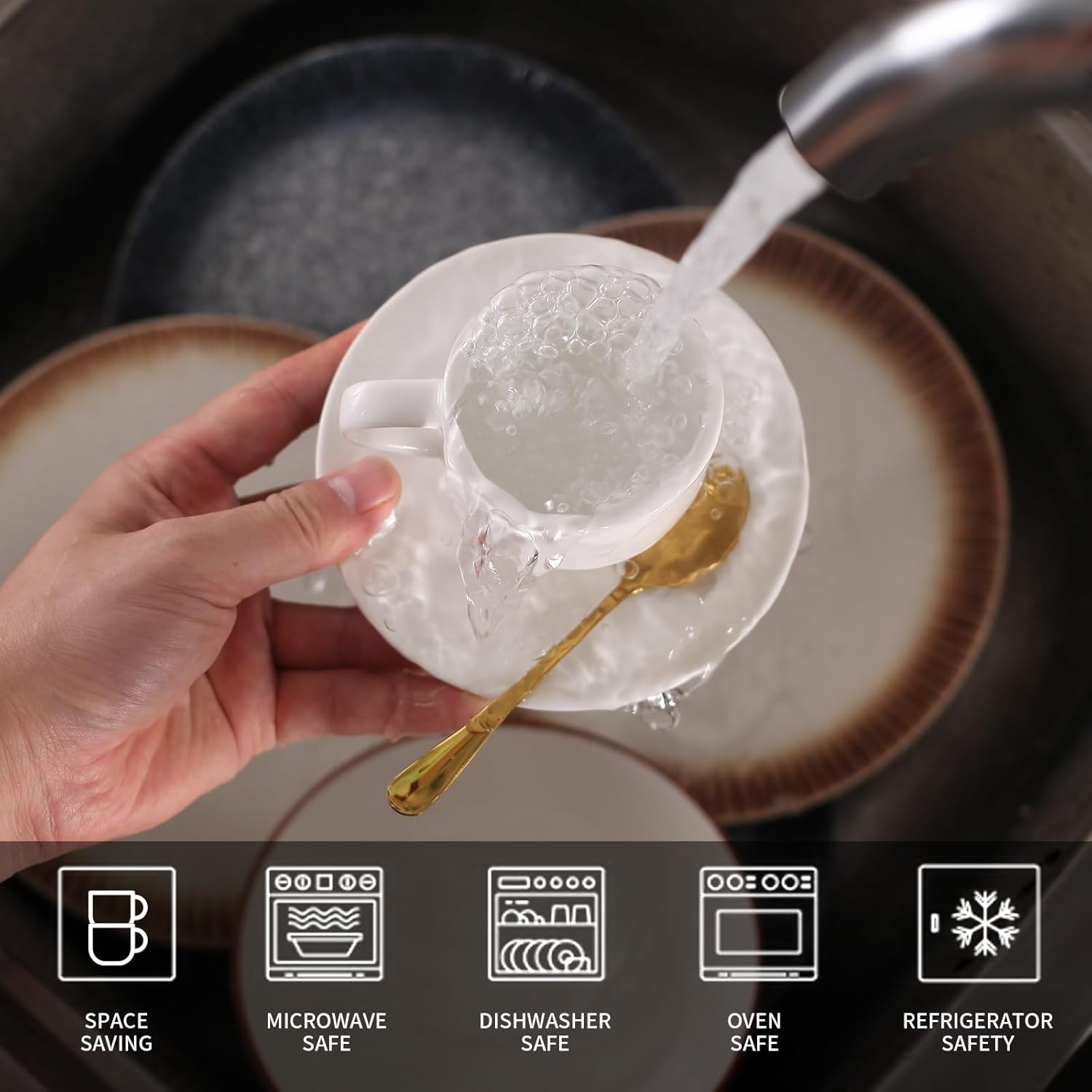 - Multi-functional Set: We've thoughtfully included saucers and spoons with each set of cups, making it convenient for you to enjoy your coffee without worrying about dirtying the table or searching for a coffee stirring tool. Plus, we've added a metal rack as a bonus, allowing you to easily organize this entire set of small coffee mug