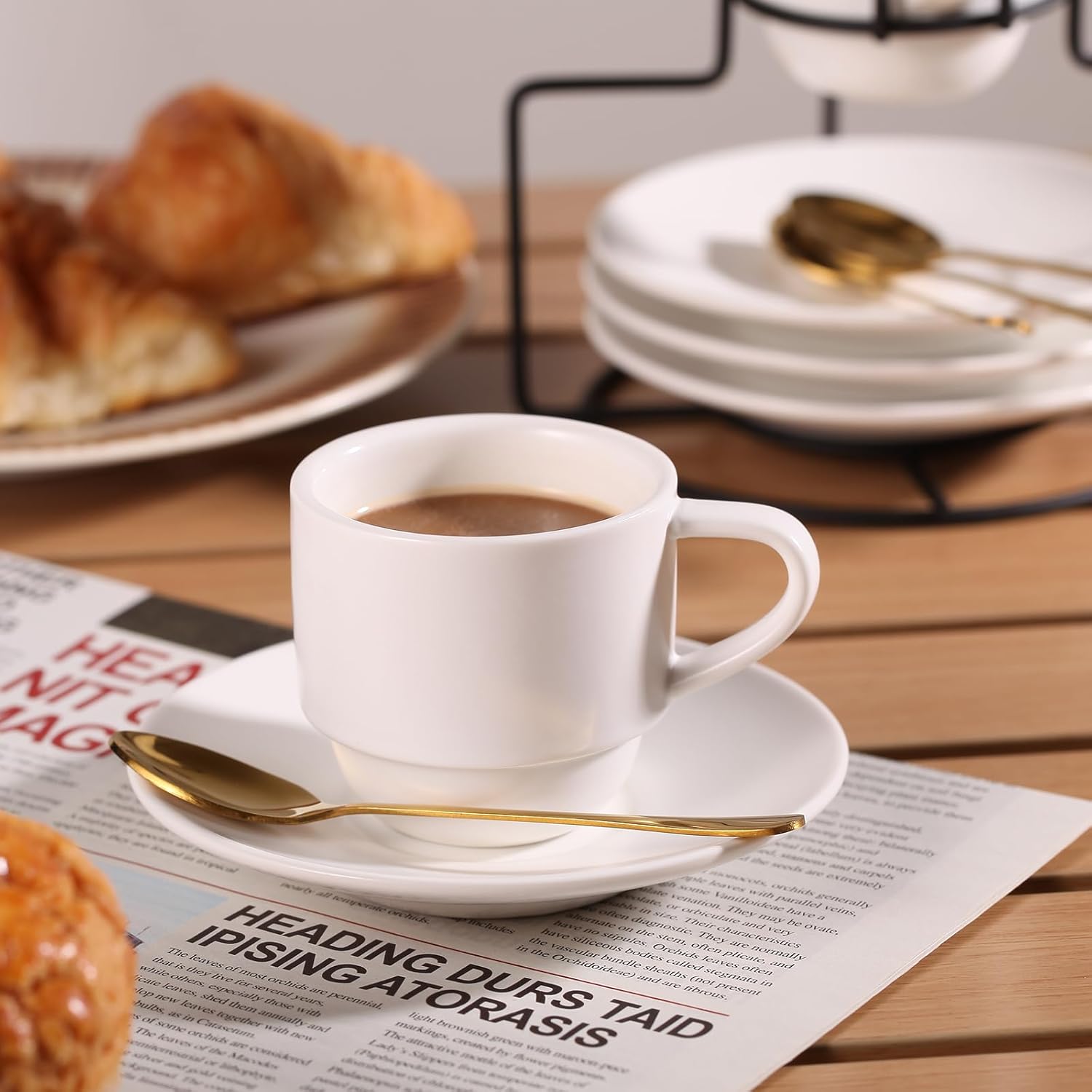 Lareina 3-Ounce Espresso Cups with Saucers, Spoons and Metal Stand, Small Stackable Coffee Cups Set of 4, Ceramic Demitasse Mugs, White