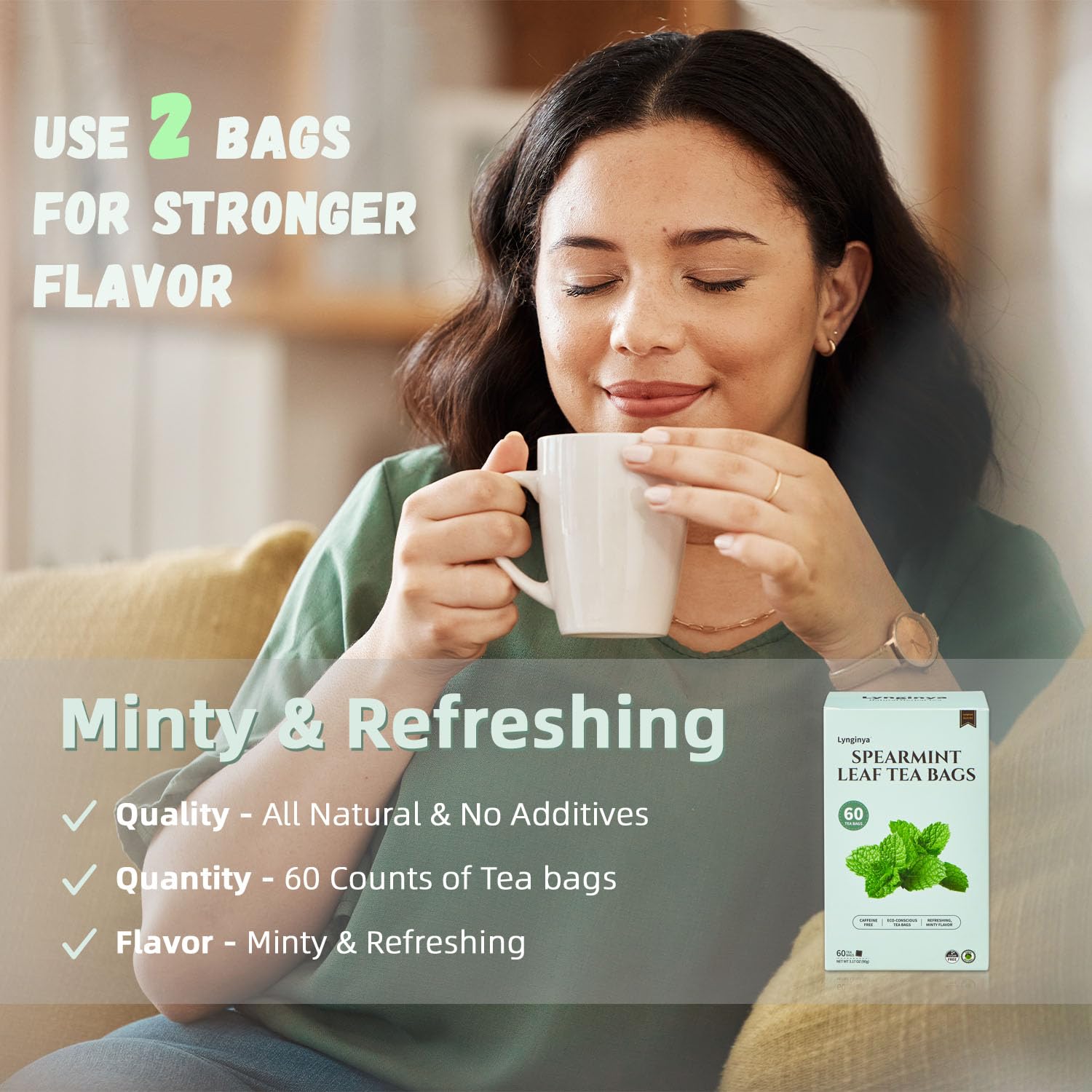 Lynginya Spearmint Tea, 60 Tea Bags - Premium Spearmint Leaves - Natural Herbal Tea - Refreshing & Minty - No Sugar & No Caffeine