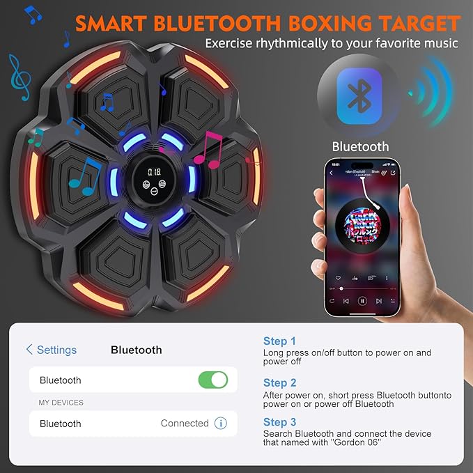 - 𝗘𝗻𝗴𝗮𝗴𝗶𝗻𝗴 𝗪𝗼𝗿𝗸𝗼𝘂𝘁 𝘄𝗶𝘁𝗵 𝗕𝗹𝘂𝗲𝘁𝗼𝗼𝘁𝗵 𝗠𝘂𝘀𝗶𝗰: The boxing machine wall mounted music with Bluetooth capability allows users to play their favorite music through Bluetooth during training. This not only adds to the fun of the workout but also combines with cool lighting effects, making each punch rhythmic and immersive with light and shadow, enhancing the dynamic and immersive experience of training.