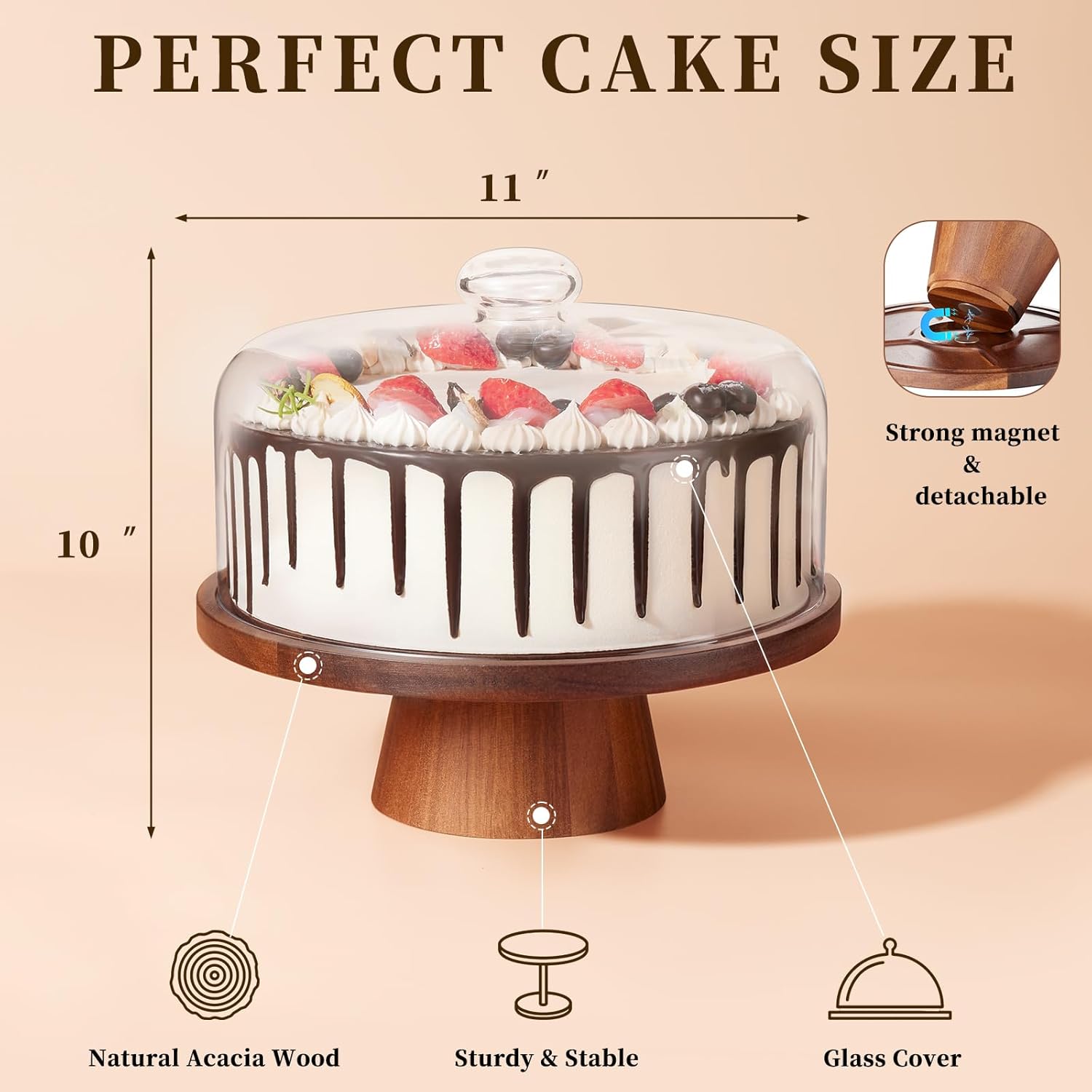 Wooden Cake Stand with Lid, Acacia Cake Stand with Glass Dome, 11-Inch Versatile Dessert Stand with Strong Magnetic Pedestal, Cake Holder for Birthday/Kitchen/Party/Charcuterie