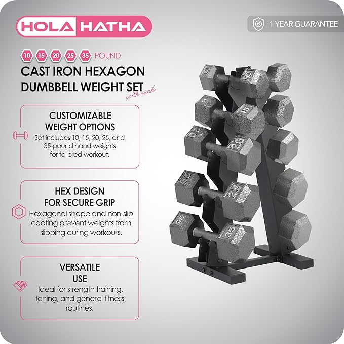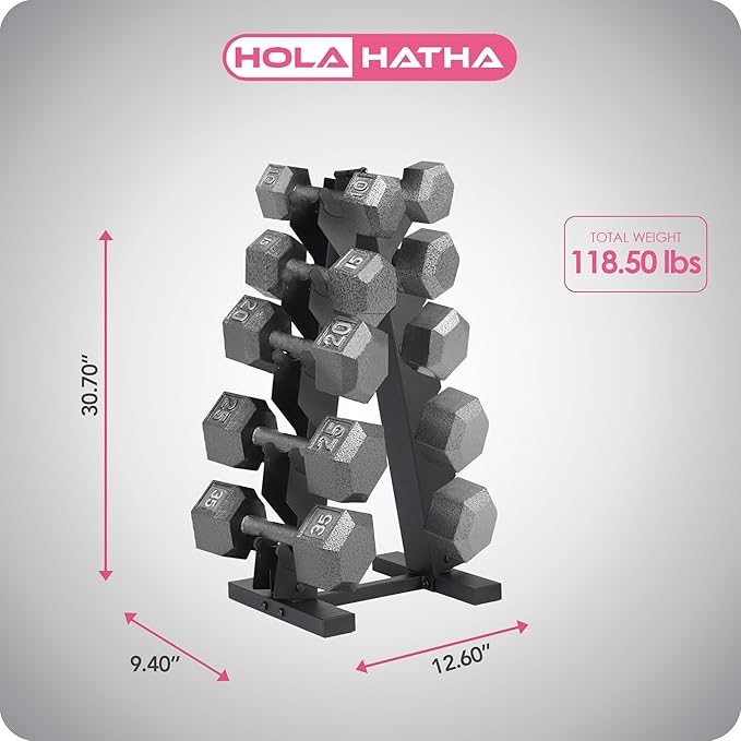 HolaHatha Hexagonal Dumbbell Free Hand Weight Set w/Rack