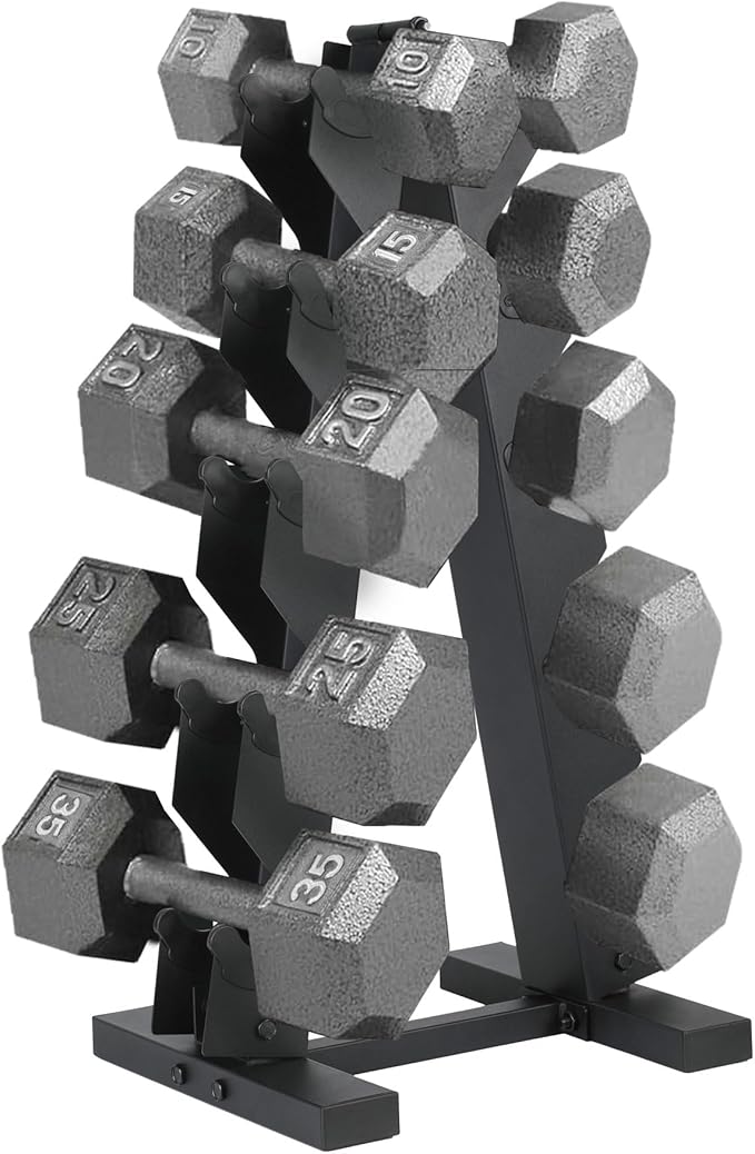 - Dumbbell Set: Dumbbell set includes a pair of 10-pound, 15-pound, 20-pound, 25-pound, and 35-pound weights, plus a convenient storage stand to keep your weight set organized