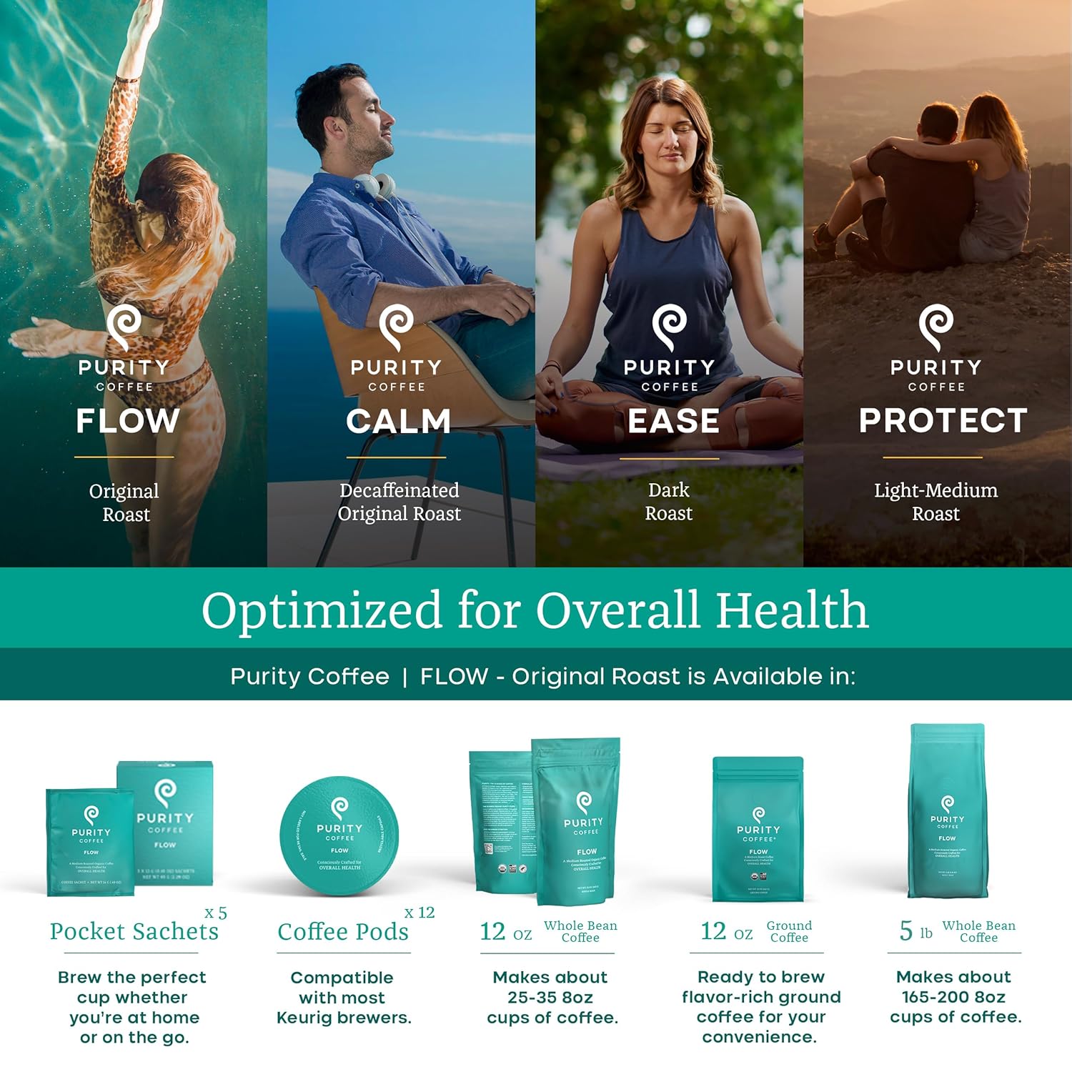 Purity Coffee FLOW Original Medium Roast Ground Coffee for Focus and Clean Energy - USDA Organic and Third-Party Tested for Antioxidants, Mold, Mycotoxins and Pesticides - 12oz (Purity Flow, medium_roast) | Ground| FLOW