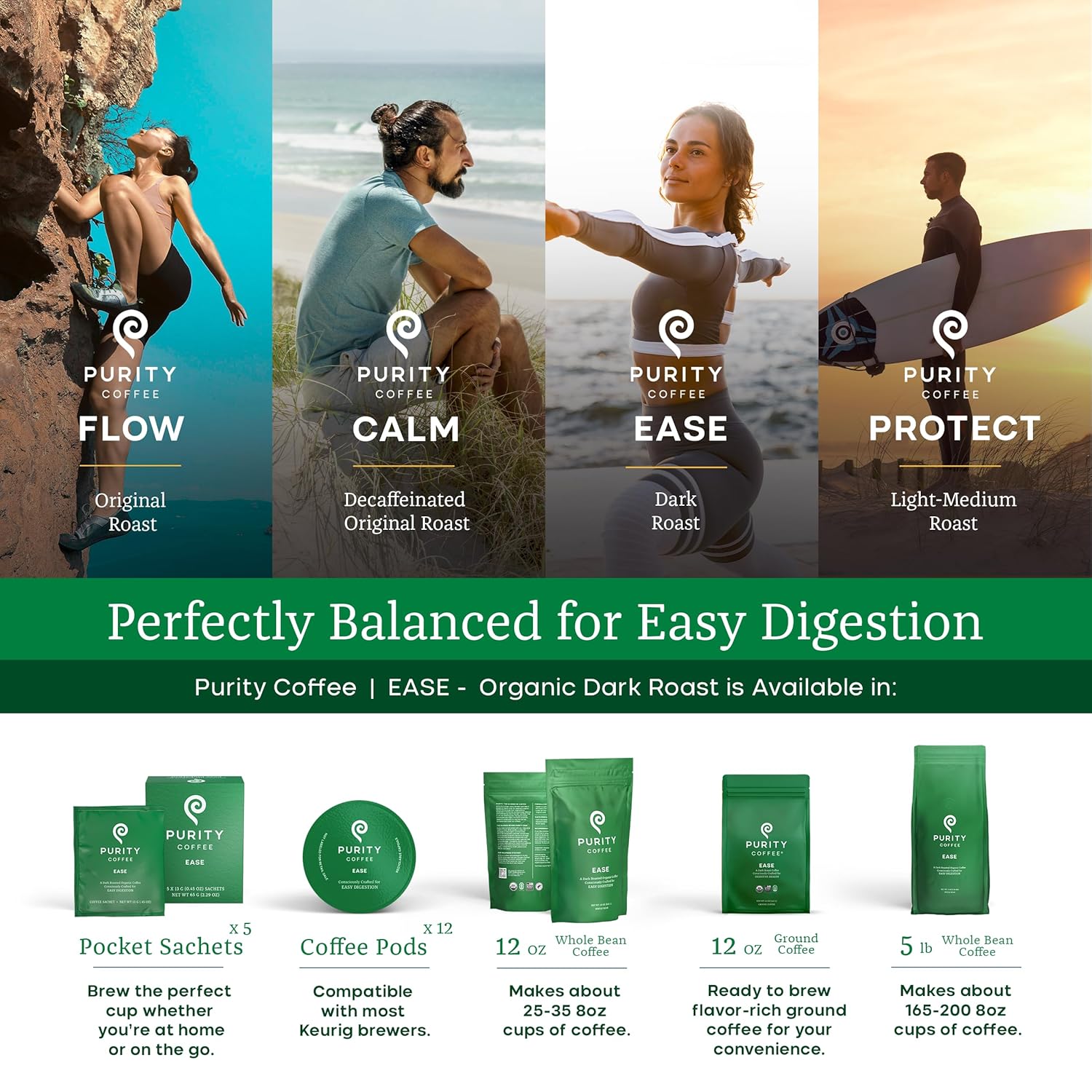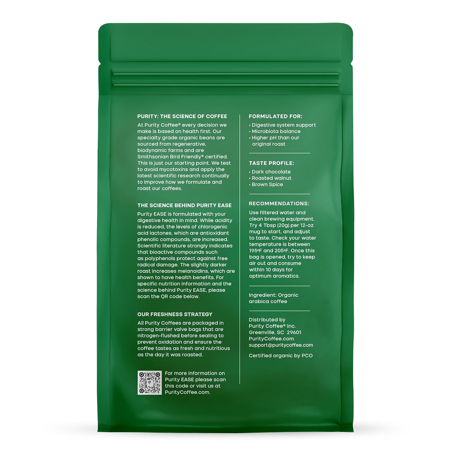 Purity Coffee EASE Dark Roast Ground Coffee for Low Acidity - USDA Organic and Third-Party Tested for Antioxidants, Mold, Mycotoxins and Pesticides - 12oz (Purity Ease, dark_roast) | Ground| EASE