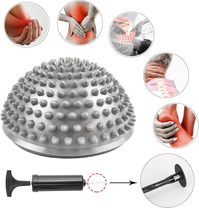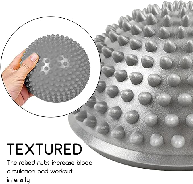 - IMPROVE CIRCULATION: The balance pod has a Semi-sphere dome design with a spikey soft textured surface for grip, massage, and to stimulate blood flow to the skin surface. The half ball balance trainer can be used dome or flat side down to challenge your exercise routines and for varying benefits.