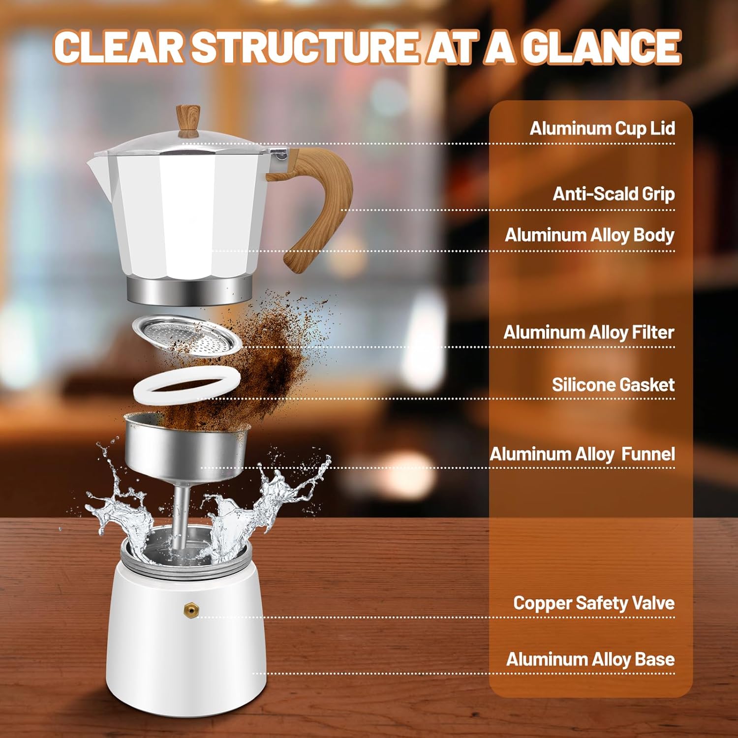 - How to Prepare the Coffee: When you use it for the first time, the coffee pot may emit an unpleasant smell, please don't worry too much, this is a normal situation. Pls add tea, oranges, detergent, or other items to remove odor and wash several times before use. Can be used on gas or ceramic stove tops, allows you to create and enjoy the best-tasting coffee with utmost ease. Classic Italian style design ensures even heat distribution for rich, velvety coffee flavor and aroma