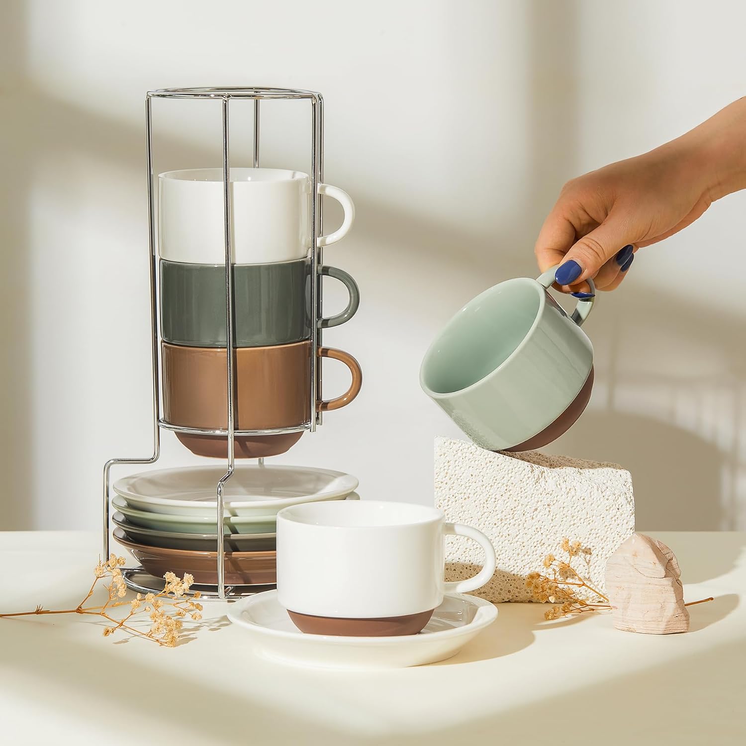 Sweese 8 Ounce Cappuccino Cups Set of 4, Porcelain Stackable Coffee Cups with Saucers and Metal Stand, Multicolor