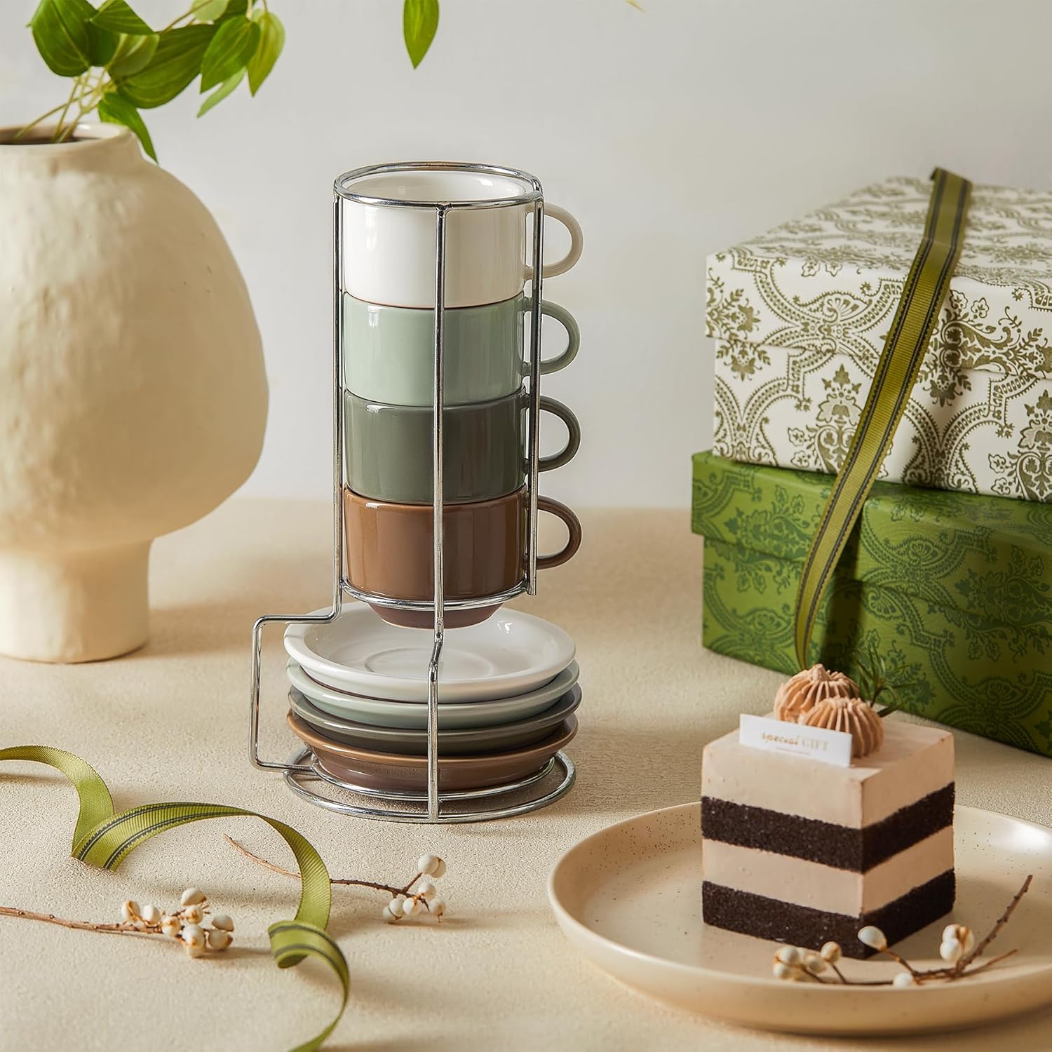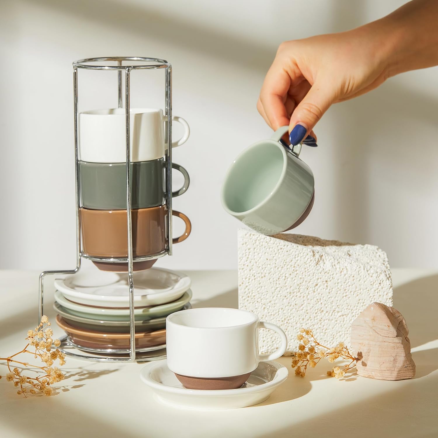 - REDEFINING CONVENIENCE IN EVERY CORNER: Transform your living space with Space-Saving & No Mess perfection. Our innovative stacking rack design keeps your cup set together, occupying just the space of one saucer. Say goodbye to clutter – even the tiniest nook becomes tidy with this compact solution, ensuring your coffee corner remains pristine and mess-free. Enjoy the simplicity of organized living.