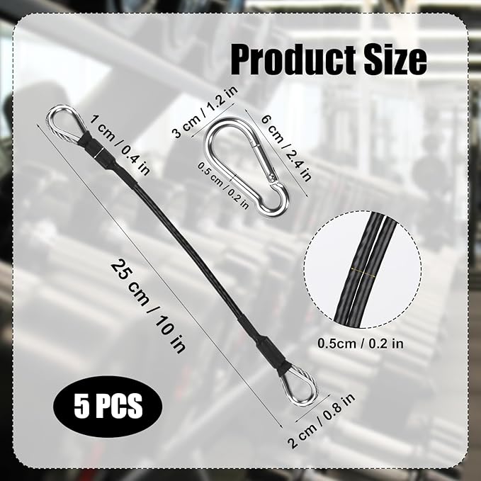 - Size: The gym cable extension is about 25x2x1cm/10x0.8x0.4in; the carabiner is about 6x3x0.5cm/2.4x1.2x0.2in.