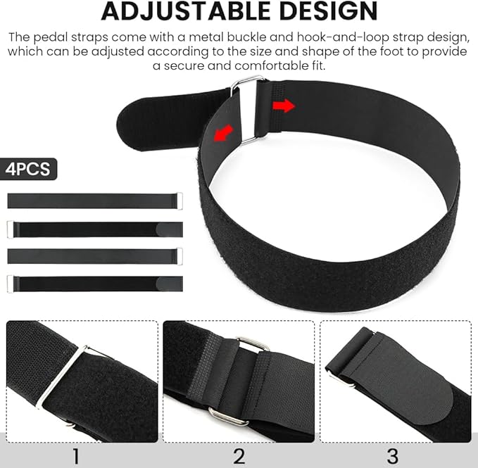 - 【ADJUSTABLE DESIGN】The pedal straps come with a metal buckle and hook-and-loop strap design, which can be adjusted according to the size and shape of the foot to provide a secure and comfortable fit. Easy to put on and take off.