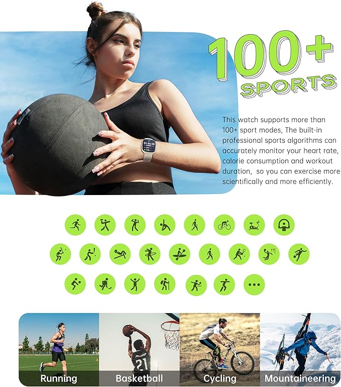 - 👍[Precise activity tracking smartwatch] This smartwatch supports more than 100 sports modes, including walking, running, cycling, swimming, badminton, basketball, football and rope skipping. This variety of sports experiences is designed to keep you excited and motivated, while the lightweight and fashionable design ensures you stay protected. The three plastic and nylon straps are sweat-proof, dust-proof and breathable, adding to your comfort and convenience.