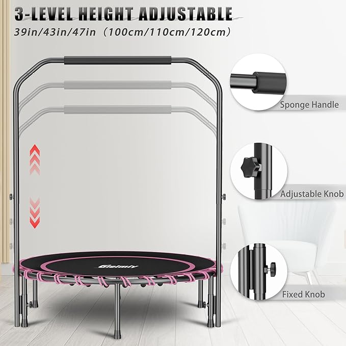 - ✅【Stable Structural Design】:Gielmiy Fitness Trampoline is made of thick tube which is 25MM, 6 legs 25MM of the diameter ,supports for more durability and covered with White powder coating to prevent rust and corrosion.Thanks to its premium quality, boasts an extended lifetime to witness your precious journey from a total beginner to a star pro!
