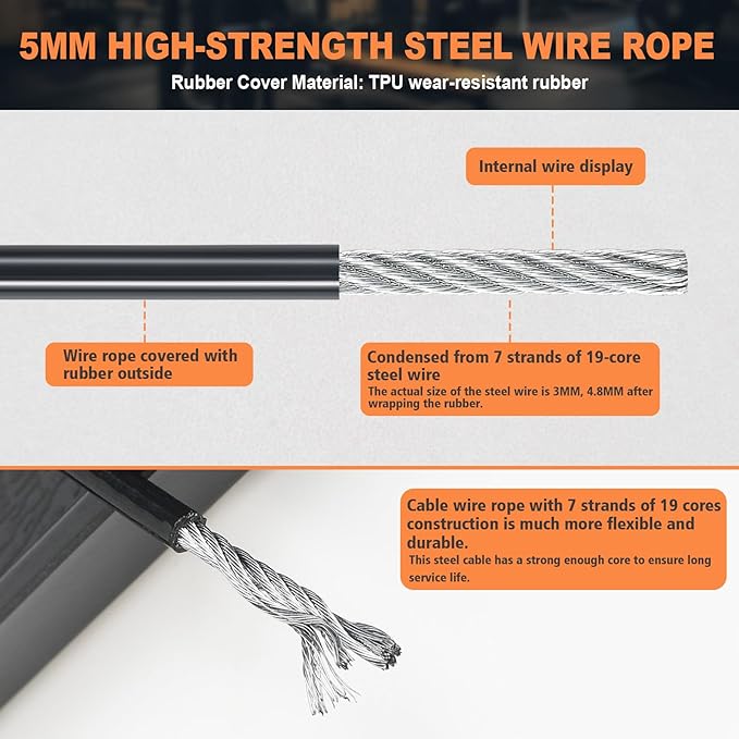 - 【Excellent Quality】 The SERTT steel cable is coated with TPU wear-resistant rubber and the inner wire is made of 7 strands of 19-core steel wire. Thickness: 0.2 inches (5 mm). It has high tensile strength for increased application safety. Maximum load capacity is up to 1500 lbs.