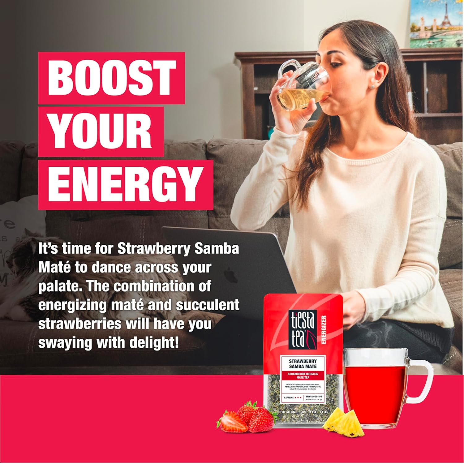 - REVITALIZE YOUR DAY WITH STRAWBERRY HIBISCUS MATÉ TEA: Experience the vibrant dance of flavors with Tiesta Tea's Strawberry Hibiscus Maté Tea. This energizing blend combines the invigorating qualities of maté with the luscious taste of strawberries, creating a refreshing and revitalizing beverage that will keep you moving throughout your day.