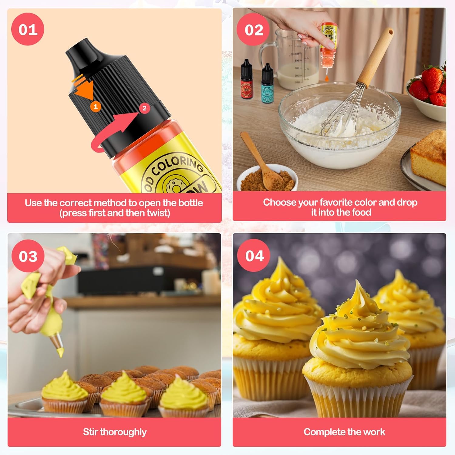 - Newest Baking Food Coloring Set - We have always been committed to developing rich colors and good experiences for our customers. As for the bottle itself, we have upgraded it to be the latest child-safe and friendly, so there is no need to worry about children eating it accidentally. For the correct usage, please refer to the order in the picture. We have also upgraded the squeeze bottles, which will make us better control without worrying about leakage during transportation