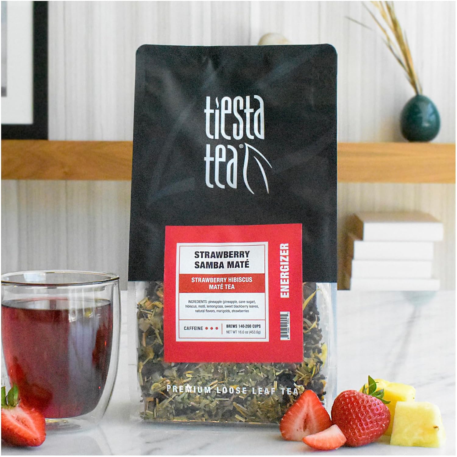 Tiesta Tea - Strawberry Samba Mate, Loose Leaf, Strawberry Hibiscus Mate Tea, High Caffeinated Fruit Blend, Make Hot or Iced Up to 200 Cups, 16oz Resealable Bulk Pouch