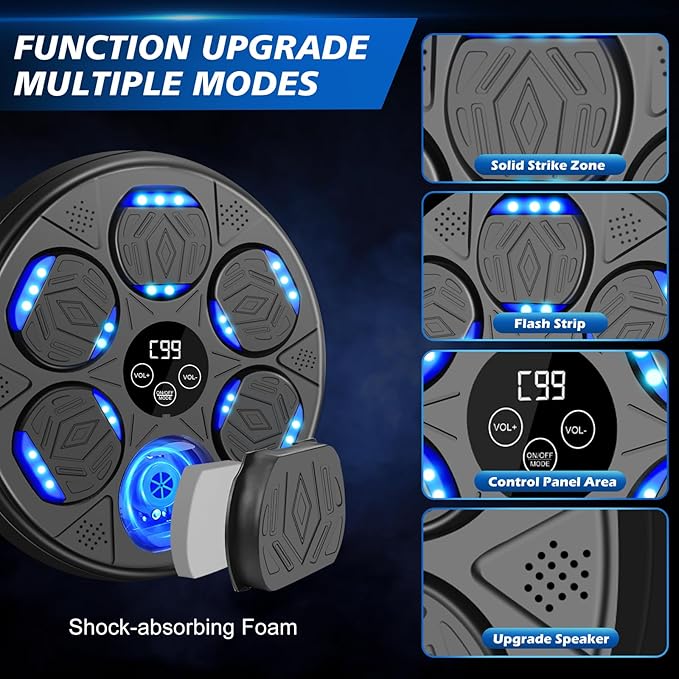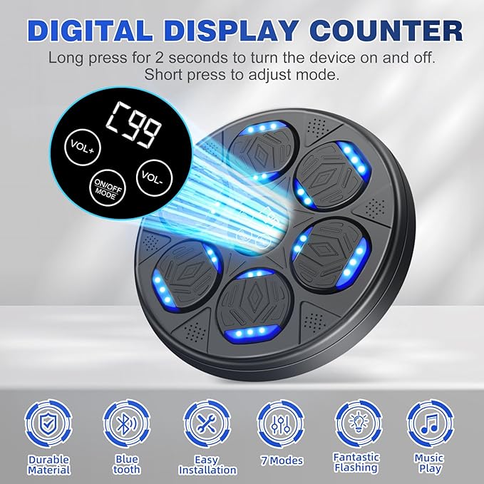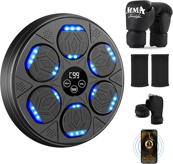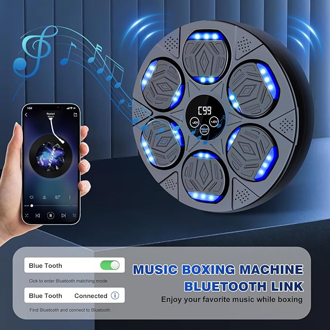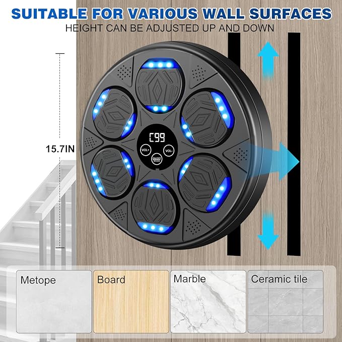 - 【LED Display】The illuminated pods synchronize beautifully with music, adding a gamified twist to boxing sessions .The LED display can count your hits and has random lights that light up to hit,recording your every progress and growth. Smart music boxing machine supports Bluetooth, you can Enjoy your favorite music while boxing. Surround speakers and cool lights keep you immersed while training.