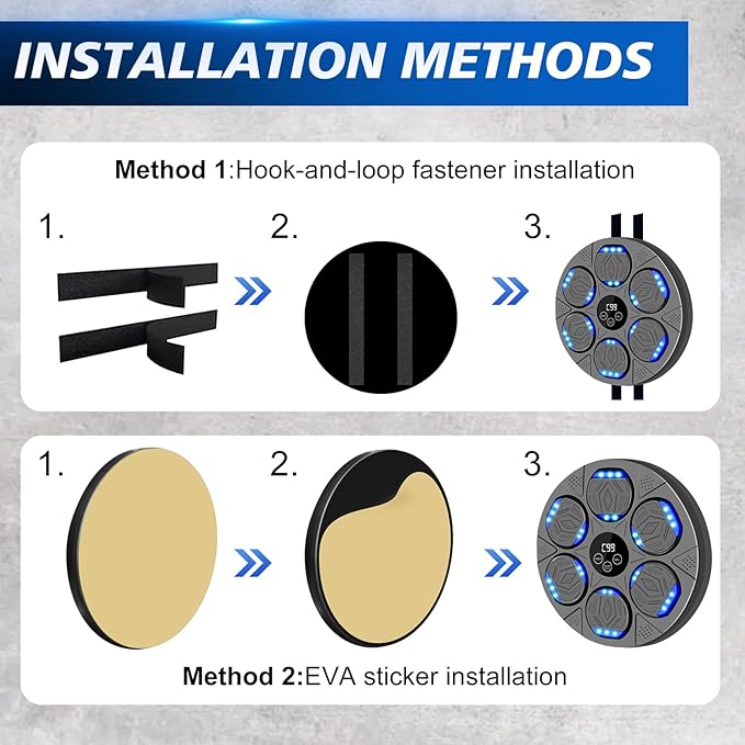 - 【Easy to Install】This bluetooth music boxing machine is wall-mounted. You don't have to put a hole on the wall at all, by using double-sided tape or Hook-and-Loop fastener to fix the Bluetooth boxing machine on the wall. You don't need to go to the gym and workout at home, saving you time and money. Go to the beat of your music and get a sweat in! The kids even get involved!
