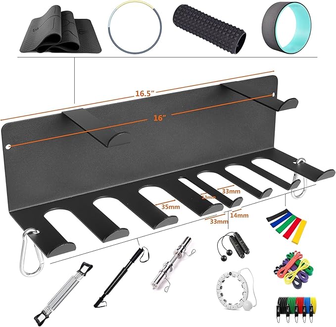 - The size of the rack is 16.5"(L) x 5.5"(W) x 4.5"(H). 8 prongs and 2 foam rollers hooks can store a lot of fitness equipment